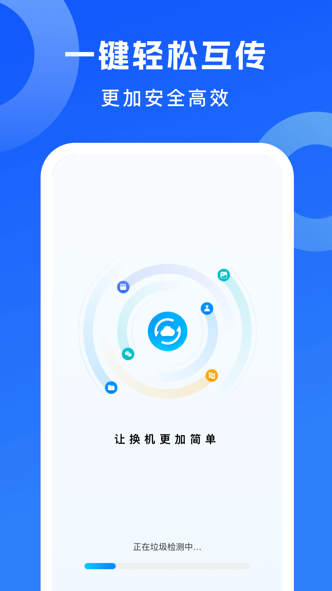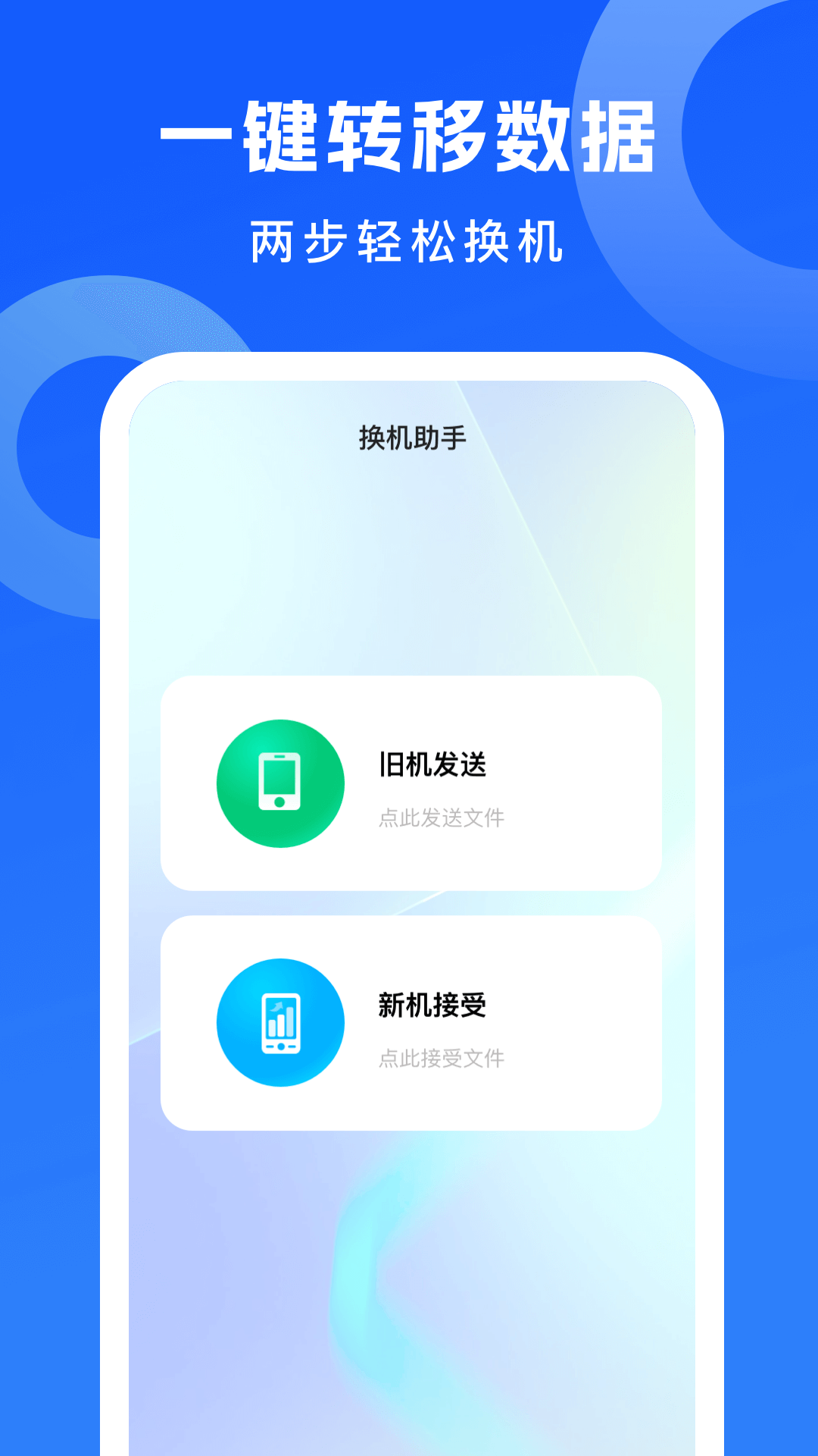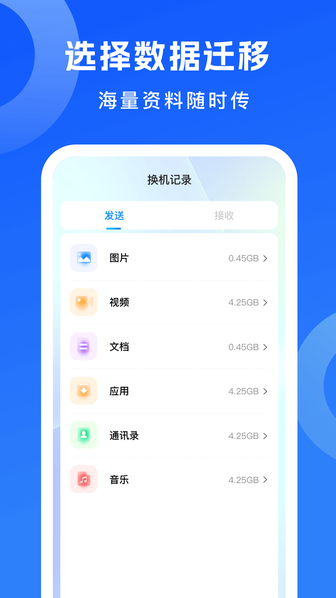一款传输类应用。可以快速传输照片、通讯录、音频、视频等数据至新手机,操作快捷、简单方便,让您解除换机带来的困扰。 传输过程传输速度快,高效稳定,且免流量。